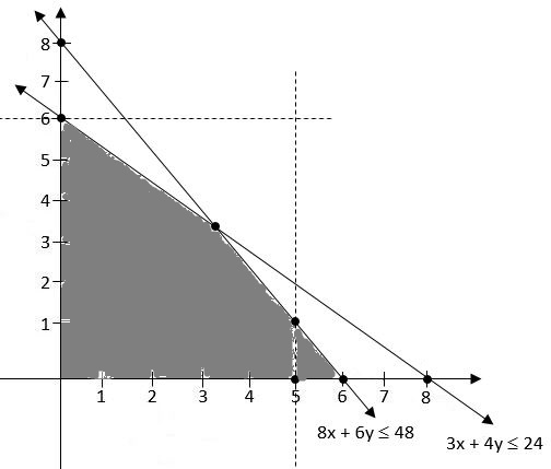 The objective function $z= 4x + 3y $ can be maximised subject to the constraints $3x+ 4y ≤24, 8x+6y ≤48, x ≤ 5, y ≤ 6, x ≥ 0, y≥0 :$ |