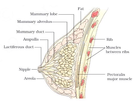 The correct answer is Option (2) → Cells of alveoli . A functional mammary gland is characteristic of all female mammals. The mammary glands are paired structures (breasts) that contain glandular tissue and variable amount of fat. The glandular tissue of each breast is divided into 15-20 mammary lobes containing clusters of cells called alveoli. The cells of alveoli secrete milk, which is stored in the cavities (lumens) of alveoli. The alveoli open into mammary tubules. The tubules of each lobe join to form a mammary duct. Several mammary ducts join to form a wider mammary ampulla which is connected to lactiferous duct through which milk is sucked out. A diagrammatic sectional view of Mammary gland |