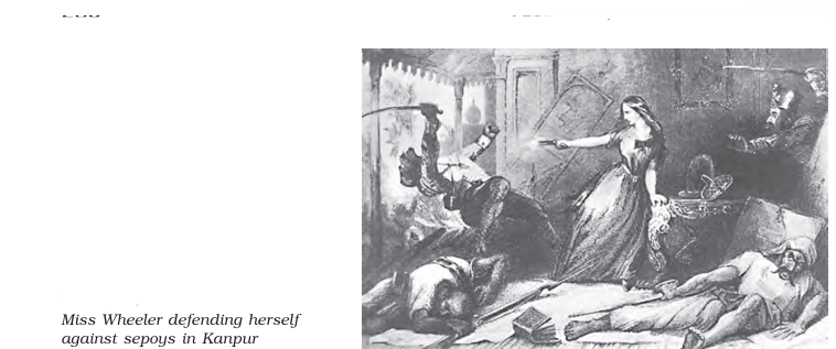 The correct answer is Option (3) → Miss Wheeler " ...In another set of sketches and paintings we see women in a different light. They appear heroic, defending themselves against the attack of rebels. Miss Wheeler stands firmly at the centre, defending her honour, single-handedly killing the attacking rebels. As in all such British representations, the rebels are demonised. Here, four burly males with swords and guns are shown attacking a woman. The woman’s struggle to save her honour and her life, in fact, is represented as having a deeper religious connotation: it is a battle to save the honour of Christianity. The book lying on the floor is the Bible."