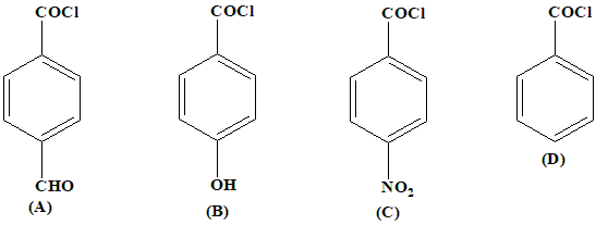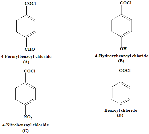 To arrange the given compounds in increasing order of their rate of hydrolysis, we need to consider the electronic effects of the substituents on the benzoyl chloride group. Hydrolysis of benzoyl chlorides involves the attack of water on the carbonyl carbon, and the rate of this reaction depends on how electron-deficient the carbonyl carbon is. Electron-withdrawing groups (EWGs) increase the electron deficiency on the carbonyl carbon, making it more reactive towards nucleophilic attack (in this case, water), thereby increasing the rate of hydrolysis. Analysis of Each Compound: A. 4-Formylbenzoyl chloride: The formyl group (-CHO) at the para position is an electron-withdrawing group (EWG) due to its ability to withdraw electron density via both the inductive and resonance effects. This increases the electron deficiency on the carbonyl carbon, making it more susceptible to nucleophilic attack and increasing the rate of hydrolysis. High rate of hydrolysis. B. 4-Hydroxybenzoyl chloride: The hydroxy group (-OH) at the para position is an electron-donating group (EDG) through resonance, which reduces the electron deficiency on the carbonyl carbon, making it less reactive towards nucleophiles like water. Low rate of hydrolysis due to this electron-donating effect. C. 4-Nitrobenzoyl chloride: The nitro group (-NO₂) is a strong electron-withdrawing group (EWG) through both inductive and resonance effects. This group significantly increases the electron deficiency on the carbonyl carbon, making it highly reactive towards nucleophiles like water. Very high rate of hydrolysis due to the strong electron-withdrawing effect. D. Benzoyl chloride: Benzoyl chloride has no substituent, so the reactivity depends only on the carbonyl group itself. Moderate rate of hydrolysis. Increasing Order of Rate of Hydrolysis: The rate of hydrolysis will increase with the increasing electron-withdrawing nature of the substituents. Electron-donating groups will decrease the rate of hydrolysis, while electron-withdrawing groups will increase it. 4-Hydroxybenzoyl chloride (B) has the lowest rate of hydrolysis due to the electron-donating hydroxy group. Benzoyl chloride (D) is more reactive than (B) due to the lack of any strong electron-donating or withdrawing groups. 4-Formylbenzoyl chloride (A) has a higher rate of hydrolysis than (D) because the formyl group is electron-withdrawing. 4-Nitrobenzoyl chloride (C) has the highest rate of hydrolysis due to the strong electron-withdrawing nitro group. Correct Order of Increasing Rate of Hydrolysis: \((B) < (D) < (A) < (C)\) |