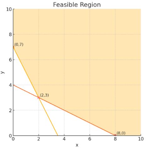The correct answer is Option (3) → 12 ** Feasible region comes from the constraints: $2x+y\ge 7,\; x+2y\ge 8,\; x\ge 0,\; y\ge 0$ Evaluate $Z=3x+2y$ at all feasible corner points: At $(0,7)$: $Z=3(0)+2(7)=14$ At $(8,0)$: $Z=3(8)+2(0)=24$ At $(2,3)$: $Z=3(2)+2(3)=12$ The minimum value of $Z$ is $12$. |
