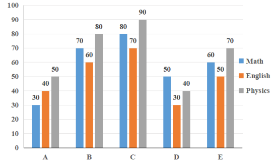 Study the given graph carefully and answer the question that follows. The graph shows the marks scored by five students in the subjects Math, English and Physics. What is the difference between the total marks obtained by B and the total marks obtained by A? |
