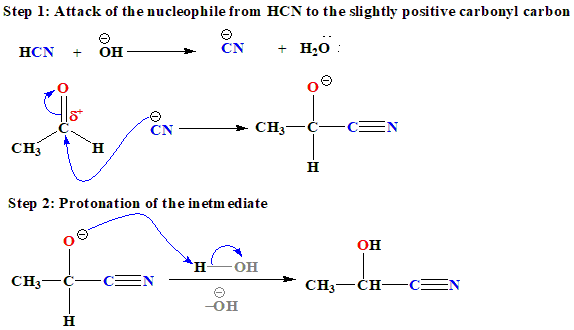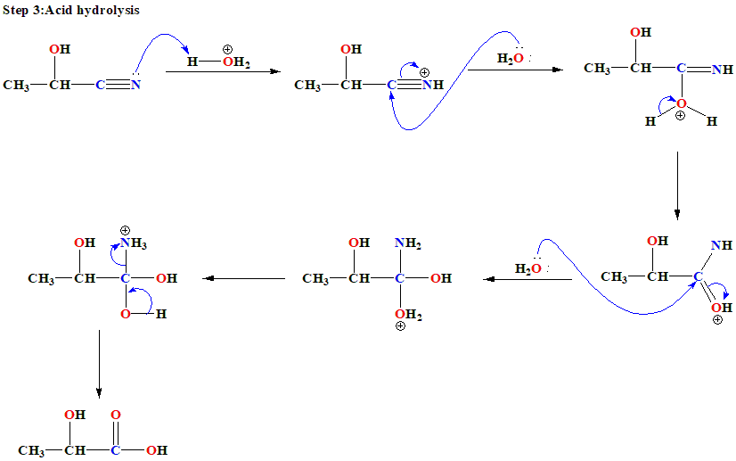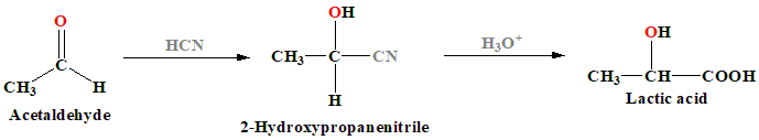 The correct answer is option 1. treating with \(HCN\) followed by hydrolysis. When acetaldehyde) reacts with hydrocyanic acid (\( \text{HCN} \)), it forms 2-hydroxypropanenitrile (also known as a cyanohydrin) where the hydroxyl group (\( \text{OH} \)) is added to the carbonyl carbon, and the cyanide group (\( \text{CN} \)) is added to the same carbon. The cyanohydrin is then hydrolyzed, typically with acidic conditions. This hydrolysis converts the cyanide group into a carboxyl group, resulting in the formation of lactic acid: