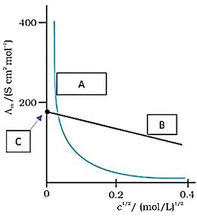 Read the passage carefully and answer. The molar conductivity of a solution at any given concentration is the conductance of the volume of solution containing one mole of electrolyte kept between two platinum electrodes with unit area of cross-section and at a distance of unit length. Both conductivity and molar conductivity change with the concentration of the electrolyte. Kohlrausch examined $Ʌ°_m$ values for a number of strong electrolytes and observed certain regularities. He noted that the difference in $Ʌ°_m$ of the electrolytes NaX and KX for any X is nearly constant. On the basis of the above observations, he enunciated the Kohlrausch law of independent migration of ions. |