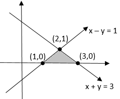 The correct answer is Option (3) → (0, 3) $x + y ≤ 3$ or $\frac{x}{3}+\frac{y}{3}≤ 3$ $x - y ≥ 1$ or $\frac{x}{1}-\frac{y}{1}≥ 1$ $x, y ≥ 0$ intersection of eq. (1) → $x+y=3$ eq. (2) → $x-y=1$ eq. (1) + eq. (2) $⇒x=2$ so $y=1$ so (0, 3) is not a corner point |
