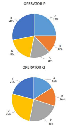 The percentage of customers of two network operators P and Q across the cities A, B, C, D, E is shown in the given pie charts. Based on the information in the pie charts. if the customers of operator P are 3.6 lakhs. and the customers of operator Q are 4.2 lakhs, then in the city C, the positive difference between the customers of the operators is: |