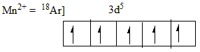 Number of unpaired electrons = 5 So, magnetic moment, \(\mu = \sqrt{n(n + 2)}\) \(\mu = \sqrt{5( 5 + 2)}\) \(\mu = \sqrt{35}\) \(\mu = 5.92\) BM |