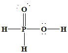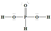 Here, phosphorus is bonded to one oxygen atom with a double bond (\(P=O\)), two hydroxyl groups (\(P-OH\)), and one hydrogen atom directly attached to phosphorus (\(P-H\)). Only the hydrogen atoms in the \(P-OH\) groups are ionizable. Therefore, phosphorous acid has a basicity of 2. Hypophosphorous Acid \((H_3PO_2)\): \(H_3PO_2\) has the structure:
