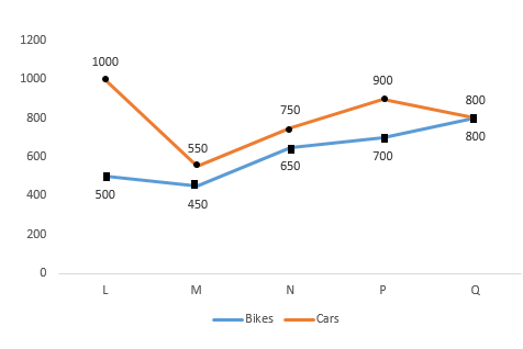 The line chart given below shows the sales of bikes and cars of five companies L, M, N, P and Q.