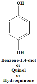 The correct answer is option 4. Benzene-1,4-diol. The correct IUPAC name of quinol is Benzene-1,4-diol. Quinol is a common name for a compound with the chemical formula \(C_6H_4(OH)_2\). It consists of a benzene ring with two hydroxyl groups (-OH) attached to it. The hydroxyl groups are positioned on carbon atoms 1 and 4 of the benzene ring, making it a para-substituted compound. Thus, the correct IUPAC name for quinol is Benzene-1,4-diol. The structure of quinol will be as follows: