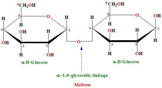 The correct answer is option 4. Sucrose. Reducing Sugars: A reducing sugar is one that can donate electrons to another molecule, specifically to a mild oxidizing agent like Benedict's reagent, which results in the reduction of the reagent and the oxidation of the sugar. This ability to act as a reducing agent comes from the presence of a free anomeric carbon. An anomeric carbon is the carbon atom that was the carbonyl carbon \((C=O)\) in the open-chain form of the sugar. In the ring form of the sugar, this carbon becomes a part of the glycosidic bond. For a sugar to be reducing, it must be able to open up to its linear form, exposing the aldehyde (in aldoses) or ketone (in ketoses) group that can act as a reducing agent. Non-Reducing Sugars: Non-reducing sugars, on the other hand, do not have a free anomeric carbon because their anomeric carbons are involved in a glycosidic bond, which prevents them from opening up into the linear form. As a result, they cannot act as reducing agents and do not react with Benedict's reagent or similar oxidizing agents. Analysis of the Given Sugars: 1. Maltose: Maltose is a disaccharide composed of two glucose units linked by an α(1→4) glycosidic bond. The glycosidic bond is formed between the anomeric carbon of one glucose and the hydroxyl group on the fourth carbon of the second glucose. The second glucose unit in maltose has a free anomeric carbon that can open to its aldehyde form, making maltose a reducing sugar.