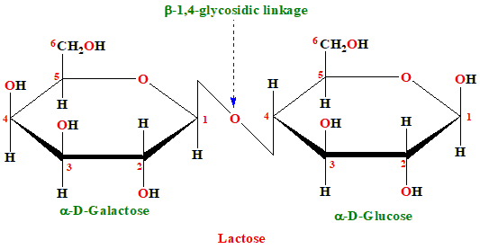 2. Lactose: Lactose is a disaccharide composed of galactose and glucose linked by a β(1→4) glycosidic bond. The glycosidic bond is between the anomeric carbon of galactose and the fourth carbon of glucose. The glucose unit has a free anomeric carbon that can open to its aldehyde form, making lactose a reducing sugar.