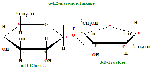 4. Sucrose: Sucrose is a disaccharide composed of glucose and fructose linked by an α(1→2) glycosidic bond. The glycosidic bond involves the anomeric carbon of glucose and the anomeric carbon of fructose. Because both anomeric carbons are involved in the glycosidic bond, neither glucose nor fructose can open up to their aldehyde or ketone forms. As a result, sucrose cannot act as a reducing agent, making it a non-reducing sugar.