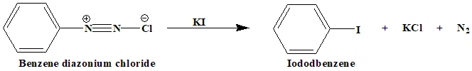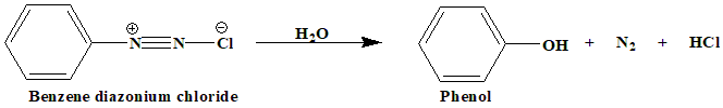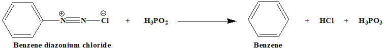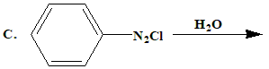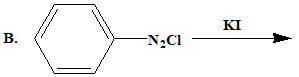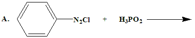 Let us look at each of the given reactions: A. When benzene diazonium chloride reacts with hypophosphorous acid (\( \text{H}_3\text{PO}_2 \)), it undergoes a reduction reaction. The hypophosphorous acid reduces the diazonium group (\(-\text{N}_2^+\)) to a phenyl group (\(-\text{H}\)). The general reaction is: Benzene Diazonium Chloride (\(\text{C}_6\text{H}_5\text{N}_2\text{Cl}\)) is a diazonium salt where the diazonium group (\(-\text{N}_2^+\)) is attached to a benzene ring. It acts as a reducing agent. It reduces the diazonium group to a phenyl group while itself being oxidized to phosphorous acid (\(\text{H}_3\text{PO}_3\)). The benzene diazonium chloride is reduced to benzene. B. When benzene diazonium chloride (\(\text{C}_6\text{H}_5\text{N}_2^+\text{Cl}^-\)) reacts with potassium iodide (\(\text{KI}\)), it undergoes a reaction known as the Sandmeyer reaction, specifically for the substitution of the diazonium group with an iodine atom. The reaction is: It is a diazonium salt where the diazonium group (\(-\text{N}_2^+\)) is attached to a benzene ring. Potassium Iodide (\(\text{KI}\)) acts as a source of iodide ions (\(\text{I}^-\)). The diazonium group (\(-\text{N}_2^+\)) is replaced by the iodide ion (\(\text{I}^-\)) in a substitution reaction. The diazonium ion (\(\text{N}_2^+\)) is a good leaving group, and it gets replaced by the iodide ion to form iodobenzene (\(\text{C}_6\text{H}_5\text{I}\)). The by-products are potassium chloride (\(\text{KCl}\)) and nitrogen gas (\(\text{N}_2\)). This reaction is an example of a Sandmeyer reaction where the diazonium group is replaced by an iodine atom, leading to the formation of iodobenzene. C. When benzene diazonium chloride (\(\text{C}_6\text{H}_5\text{N}_2^+\text{Cl}^-\)) reacts with water (\(\text{H}_2\text{O}\)), it undergoes hydrolysis. The reaction results in the formation of phenol and the release of nitrogen gas. The reaction is: