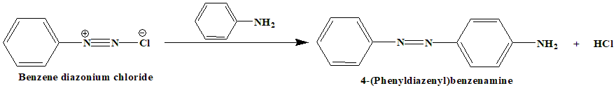 Benzene Diazonium Chloride (\(\text{C}_6\text{H}_5\text{N}_2^+\text{Cl}^-\)) is a diazonium salt where the diazonium group (\(-\text{N}_2^+\)) is attached to a benzene ring. Aniline is an aromatic amine with an amino group (\(-\text{NH}_2\)) attached to a benzene ring. It is a nucleophile in this reaction. The diazonium group (\(-\text{N}_2^+\)) is highly reactive and can couple with nucleophiles like the amino group in aniline. The diazonium ion (\(\text{N}_2^+\)) reacts with the amino group of aniline to form a diazo linkage (\(-\text{N}_2\text{-}\)) between the two benzene rings. This forms the azo compound phenylazoaniline and releases hydrochloric acid (\(\text{HCl}\)) as a by-product. The reaction between benzene diazonium chloride and aniline results in the formation of an azo compound, phenylazoaniline, which is characterized by the presence of an azo group (\(-\text{N}_2\text{-}\)) linking two benzene rings. This type of reaction is widely used in dye chemistry for producing azo dyes. |