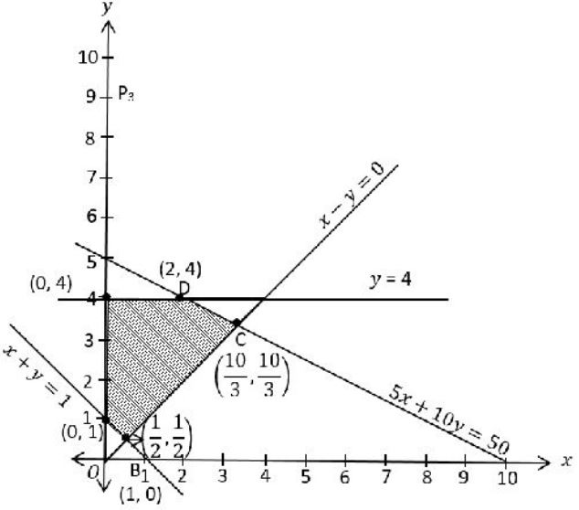 The correct answer is Option (3) → 10 ** The feasible region (from the shaded area in the graph) has the following corner points: $A(0,1),\; B(1,0),\; D(2,4),\; C\left(\frac{10}{3},\frac{10}{3}\right)$ Objective function: $z = 2x + y$ Evaluate $z$ at each corner: At $A(0,1)$: $z = 2(0)+1 = 1$ At $B(1,0)$: $z = 2(1)+0 = 2$ At $D(2,4)$: $z = 2(2)+4 = 8$ At $C\left(\frac{10}{3},\frac{10}{3}\right)$: $z = 2\cdot\frac{10}{3} + \frac{10}{3} = \frac{30}{3} = 10$ Maximum value = $10$ |