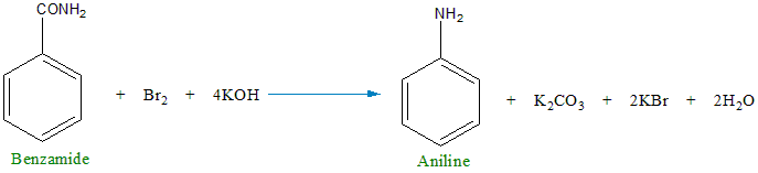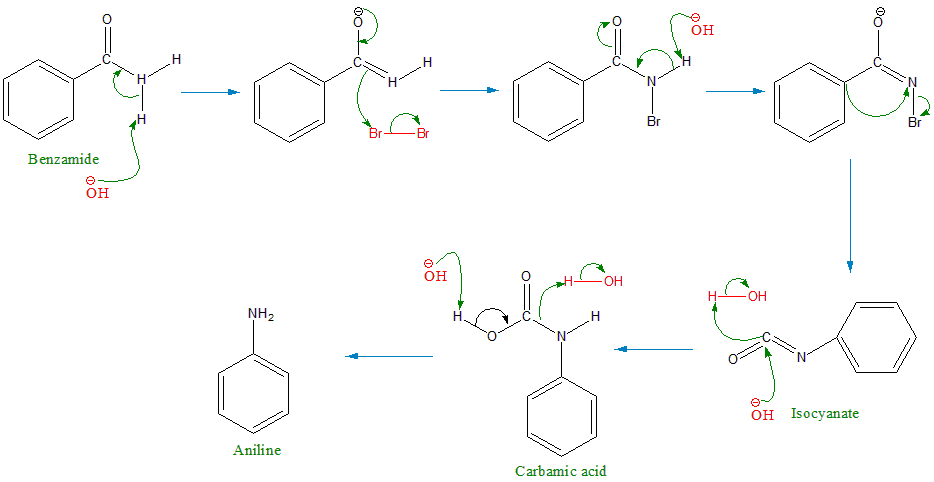 The general mechanism for the conversion of benzamide to aniline is as shown below, 1. Base such as potassium hydroxide and sodium hydroxide attacks on the amide. Base abstracts protons from benzamide. 2. In the next step the anion reacts with the bromine molecule. This generates N-bromobenzamide. This is an alpha substitution reaction. 3. Next base molecule abstracts a proton from the amide group to generate a bromamide anion. 4. Fourth step involves the rearrangement of bromoimide anion such that the benzyl Ar group migrates to the nitrogen atom. This leads to the formation of isocyanate. 5. In the next step water molecules are added to the isocyanate to form carbamic acid. On heating carbamic acid loses carbon dioxide and leads to the formation of primary amine i.e. Aniline. The mechanistic pathways for benzamide to aniline are as shown below