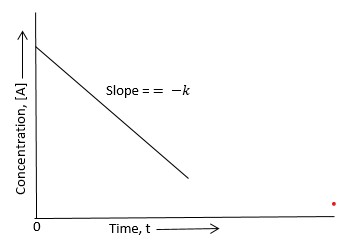 The correct answer is option 4. –ve slope and non-zero intercept. Consider the general reaction: \(A \rightarrow Products\) If it is a reaction of zero order, then the rate of reaction will be \(−\frac{d[A]}{dt} = k[A]^o\) or, \(−\frac{d[A]}{dt}= k\) \([Since, [A]^o = 1]\) or, \(d[A] = −kdt\)-----------------(i) Integrating both sides, we get \(\int{d[A]} = −k \int{dt}\) or, \([A] = −kt + c\) ---------------(ii) where, \(c\) is the constant of integration At \(t = 0, [A] = [A]_o\) \(∴ [A]_o = c\) Substituting this value in equation (i), we get \([A] = −kt + [A]_o\) or, \(kt = [A]_o − [A]\) or, \(k = \frac{1}{t}{[A]_o − [A]}\) ---------------(iii) This is the expression for rate constant for reactions of zero order. From zero order reaction, we have \([A] = −kt + [A]_o\) As it is in the form of a straight line, \(y = mx + c\) , where, slope, \(m = − k\) and the intercept, \(c =[A]_o\). So the plot of concentration, [A] versus time, t will be