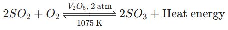 The correct answer is Option (1) → Vanadium(V) oxide In the Contact Process for manufacturing sulfuric acid, $SO_2$ is oxidized to $SO_3$ using a catalyst. (i) Production of $SO_2$: $S + O_2 \overset{\text{Burn}}{\longrightarrow} SO_2$ Or $4FeS_2 + 11O_2 \overset{\text{Roasting}}{\longrightarrow} 2Fe_2O_3 + 8SO_2$ (ii) Oxidation of $SO_2$ to $SO_3$: (iii) Conversion of $SO_3$ into $H_2SO_4$: $SO_{3} + \underset{(\text{conc.})}{H_2SO_4} \longrightarrow \underset{(\text{Oleum})}{H_2S_2O_7}$ $H_2S_2O_7 + H_2O \longrightarrow 2H_2SO_4$ Explanation Option 1: Vanadium(V) oxide Vanadium(V) oxide ($V_2O_5$) is the catalyst used in the Contact Process. It facilitates the oxidation of $SO_2$ to $SO_3$ by alternating between oxidation states. Option 2: Finely divided iron Iron is used as a catalyst in the Haber process for ammonia synthesis, not in sulphuric acid manufacture. Option 3: Nickel Nickel is used in catalytic hydrogenation of oils and alkenes, not in $SO_2$ oxidation. Option 4: Vanadium(II) oxide This is not used in the Contact Process and does not act as the required oxidation catalyst. |