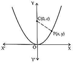 The correct answer is Option (1) → $\frac{\sqrt{4c-1}}{2}$ Let $P(x, y)$ be any point on the parabola $y = x^2$, then $|CP| = \sqrt{(x –0)^2 + (y - c)^2} = \sqrt{y + (y - c)^2}$ (using $x^2=y$) $=\sqrt{y^2 - (2 c − 1) y + c^2}$. Now $|CP|$ is shortest iff $|CP|^2$ is shortest. Let us write $|CP|^2$ as $f(y)$ i.e. $f(y) = y^2 - (2c - 1) y + c^2$ ...(i) Differentiating (i) w.r.t. y, we get $f'(y) = 2y - (2c - 1)$ and $f''(y) = 2$. $f'(y) = 0 ⇒ 2y - (2c - 1) = 0$ $⇒y=\frac{2c-1}{2}$ For $y=\frac{2c-1}{2},f''(y)=2>0$ $⇒f(y)$ is minimum when $y=\frac{2c-1}{2}$ i.e. $|CP|$ is minimum when $y=\frac{2c-1}{2}$ and the minimum value of $|CP|=\sqrt{\frac{2c-1}{2}+\left(\frac{2c-1}{2}-c\right)^2}=\sqrt{\frac{2c-1}{2}+\frac{1}{4}}=\frac{\sqrt{4c-1}}{2}$. |