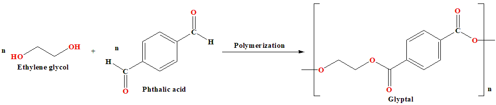 (C) Glyptal(II) Ethyleneglycol and phthalic acid Glyptal is a type of polyester resin used in coatings and paints due to its hardness and resistance to chemicals. Glyptal is made by the reaction of ethylene glycol and phthalic acid. This reaction produces a polymer with ester linkages, which contribute to its properties.