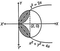 The correct answer is Option (3) → $2(\pi - \frac{8}{3})$ square units We have, $y^2 = 2x \quad \dots(i)$ and $x^2 + y^2 = 4x \quad \dots(ii)$ On solving Eqs. (i) and (ii), we get $x^2 + 2x = 4x$ $\Rightarrow x^2 - 2x = 0$ $\Rightarrow x(x - 2) = 0$ $\Rightarrow x = 0, 2$ Also, $x^2 + y^2 = 4x \Rightarrow x^2 - 4x + y^2 = 0$ $\Rightarrow x^2 - 4x + (2)^2 - (2)^2 + y^2 = 0$ $\Rightarrow (x - 2)^2 + y^2 = 2^2 \text{ which is equation of a circle with centre (2, 0) and radius 2 units.}$ $∴$ Required area $= 2 \cdot \int\limits_{0}^{2} [\sqrt{2^2 - (x - 2)^2} - \sqrt{2x}] \, dx$ $= 2 \left[ \left[ \frac{x - 2}{2} \sqrt{2^2 - (x - 2)^2} + \frac{2^2}{2} \sin^{-1} \left( \frac{x - 2}{2} \right) \right] - \left[ \sqrt{2} \cdot \frac{x^{3/2}}{3/2} \right] \right]_{0}^{2}$$ $= 2 \left[ \left( 0 + 0 - 1 \cdot 0 + 2 \cdot \frac{\pi}{2} \right) - \frac{2\sqrt{2}}{3} (2^{3/2} - 0) \right]$ $= \frac{4\pi}{2} - \frac{8 \cdot 2}{3} = 2\pi - \frac{16}{3} = 2 \left( \pi - \frac{8}{3} \right) \text{ sq. units}$ |