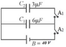 In the circuit shown below, $C_1 = 6 μF, C_2 = 3 μF$ and battery $B = 40 V$. Initially, switch $A_1$ is opened and the switch $A_2$ is closed. Now switch $A_2$ is opened and $A_1$ is closed. The charge on $C_2$ will be |