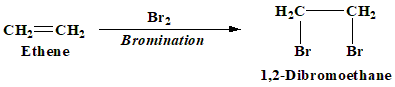 Step 2: Bromination with \(Br_2\) (B) Ethene undergoes bromination with bromine \((Br_2)\) to form 1,2-dibromoethane.