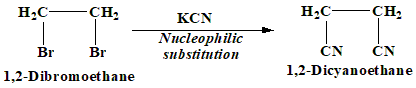 Step 3: Treatment with KCN (A) 1,2-Dibromoethane reacts with potassium cyanide \((KCN)\) in a nucleophilic substitution reaction, replacing both bromine atoms with cyanide groups, forming 1,2-dicyanoethane.