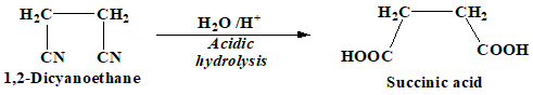 Step 4: Hydrolysis with \(H_2O/H^+\) (D) 1,2-Dicyanoethane undergoes acidic hydrolysis in the presence of water and acid \((H_2O/H^+)\) to form succinic acid.