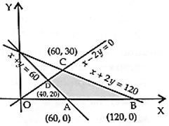 The correct answer is Option (2) → Minimum $Z=300$ at $(60,0)$; Maximum $Z=600$ at $(120,0)$ Maximize and minimize $Z = 5x + 10y$ subject to the constraints $x + 2y ≤ 120, x + y ≥ 60, x - 2y ≥ 0, x ≥ 0, y ≥ 0$. Draw the lines $x + 2y 120, x + y = 60$, and $x - 2y = 0$; shade the region satisfied by the given inequalities. The feasible region is polygon ABCD, which is convex and bounded. Corner points of feasible region are $A(60, 0), B(120, 0), C(60, 30)$ and $D(40, 20)$. The values of $Z = 5x + 10y$ at the points A, B, C and D are 300, 600, 600 and 400 respectively. Minimum value = 300 at A(60, 0), maximum value = 600 at B(120, 0) and C(60, 30). In fact, all points on the line segment BC give the same maximum value = 600. |