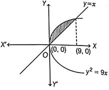 The correct answer is Option (2) → $\frac{27}{2}$ We have, $y^2 = 9x$ and $y = x$ On solving both equations, we get $x^2 = 9x$ $\Rightarrow x^2 - 9x = 0$ $\Rightarrow x(x - 9) = 0$ $\Rightarrow x = 0, 9$ $∴$ Area of shaded region $=$ Area under the curve, $(y^2 = 9x)$ $-$ area under the line, $(y = x)$ $= \int_{0}^{9} \sqrt{9x} \, dx - \int_{0}^{9} x \, dx$ $= \int_{0}^{9} 3x^{1/2} \, dx - \int_{0}^{9} x \, dx = \left[ 3 \cdot \frac{x^{3/2}}{3/2} \right]_{0}^{9} - \left[ \frac{x^2}{2} \right]_{0}^{9}$ $= \left[ 3 \cdot \frac{3^{3}}{3} \cdot 2 - 0 \right] - \left[ \frac{81}{2} - 0 \right]$ $= 54 - \frac{81}{2} = \frac{108 - 81}{2} = \frac{27}{2} \text{ sq. units}$ |