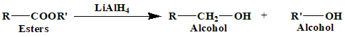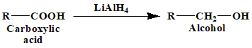 The correct answer is option 1. Lithium aluminium hydride. The reducing agent commonly used for the reduction of carboxylic acids and esters to their corresponding alcohols is lithium aluminium hydride \((LiAlH_4)\). Lithium Aluminium Hydride \((LiAlH_4)\): \(LiAlH_4\) is a very strong reducing agent. It is capable of reducing carboxylic acids, esters, aldehydes, ketones, and other carbonyl-containing compounds to their corresponding alcohols. The reduction involves the transfer of hydride ions \((H^-)\) from \(LiAlH_4\) to the carbonyl carbon, ultimately reducing it to an alcohol. Reduction Reactions: 1. Carboxylic Acids to Primary Alcohols: