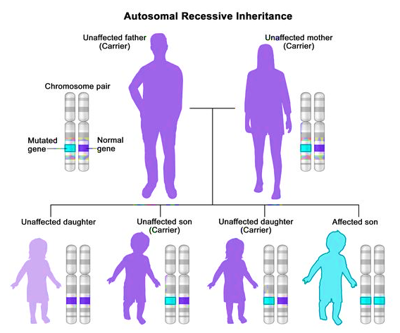 The correct answer is Option (4) → $aa$ In autosomal recessive inheritance, a genetic condition occurs when one variant is present on both alleles (copies) of a given gene. Autosomal recessive trait (example : sickle -cell anaemia ). Autosomal recessive inheritance is a mode of genetic transmission in which a condition or trait is passed from parent to child. A genetic disorder occurs when a child inherits one mutated (altered) gene copy from each parent. Typically, the parents of a child with an autosomal recessive condition do not exhibit the condition themselves. These unaffected parents are referred to as carriers, as they each possess one copy of the mutated gene and have the potential to pass it on to their offspring. |