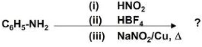 The correct answer is Option (2) → Nitrobenzene Step-by-Step Reaction Mechanism This sequence describes a specialized method for introducing a nitro group into a benzene ring, often called the Schiemann-like nitration or a variation of the Balz-Schiemann reaction: Step (i): Diazotization Aniline ($C_6H_5NH_2$) reacts with nitrous acid ($HNO_2$), typically generated in situ from $NaNO_2$ and $HCl$ at low temperatures ($0\text{–}5^\circ\text{C}$), to form the benzene diazonium cation ($C_6H_5N_2^+$). Step (ii): Formation of Fluoroborate Salt The addition of fluoroboric acid ($HBF_4$) precipitates the diazonium salt as benzene diazonium fluoroborate ($C_6H_5N_2^+BF_4^-$). This salt is relatively stable and can be isolated. Step (iii): Nitration via Nitro-de-diazoniation Heating the benzene diazonium fluoroborate with aqueous sodium nitrite ($NaNO_2$) in the presence of copper powder catalyst ($Cu, \Delta$) results in the replacement of the diazonium group with a nitro group ($-NO_2$). Conclusion While $HBF_4$ is often associated with the synthesis of fluorobenzene (Balz-Schiemann reaction), the addition of $NaNO_2$ and $Cu$ in the final step specifically directs the reaction to form Nitrobenzene. |