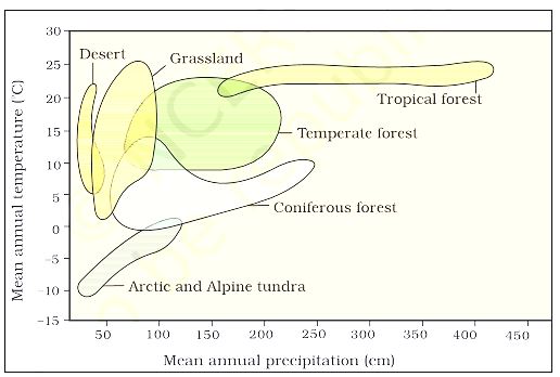 The correct answer is Option (2) → E ( Coniferous forest) A biome is a large ecological area on the Earth's surface with distinct climate, plants, and animals that are adapted to that environment. Biomes are defined by factors like temperature, precipitation, and the types of vegetation that thrive there. They form in response to climatic patterns and are often classified by their dominant vegetation and geography. Some major biomes are : Tropical forest ,Desert, Arctic and Alpine Tundra,Grassland ,Temperate Forest and coniferous forest etc. Biome distribution with respect to annual temperature and precipitation |