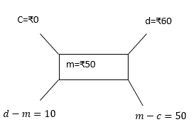 The correct answer is option (2) : 1 : 5 Cost of water (c) = ₹0 Cost of milk (d) = ₹ 60 /litre Cost of resulting mixture (m) = ₹ 50 /litre So, $\frac{\text{quantity of water}}{\text{quantity of milk}}=\frac{10}{50}=\frac{1}{5}$ Hence, the required ratio is $1: 5$ |