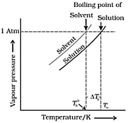The vapour pressure curve for solution lies below the curve for pure water. The diagram shows that $ΔT_b$ denotes the elevation of boiling point of a solvent in solution, Boiling point elevation occurs because adding a solute lowers the vapor pressure, requiring a higher temperature to boil. Option A: A solution which obeys Raoult's law strictly is called an ideal solution Ideal solutions follow Raoult's law at all concentrations. Hence correct. Option B: A solution which shows deviations from Raoult's law is called the Real solution Non-ideal solutions deviate from Raoult’s law. Hence correct. Option C: ΔTb = Tb − T This is incorrect. Correct expression: ΔTᵦ = T(solution) − T(solvent) Hence wrong. Option D: Elevation of boiling point is related to lowering of vapor pressure Addition of solute lowers vapor pressure. To boil, solution needs higher temperature. Hence boiling point increases. Correct. So Option 1 - (A), (B) and (D) only is correct