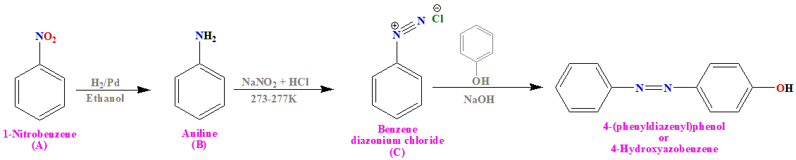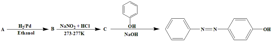 The correct answer is option 1. The final product here is an azo dye. We know 5hat to prepare an azo dye we need a phenol, sodium hydroxide and a benzene diazonium chloride. The the compound \(C\) has to be a benzene diazonium chloride. We know to prepare a diazonium chloride by diazotization we need an amine, so the compound \(B\) must be Aniline. also knoe to prepare an amine via reduction we need a nitro compound so the compound \(A\) must be a nitrobenzene. Now, let us look at the schematics of the reaction: