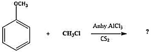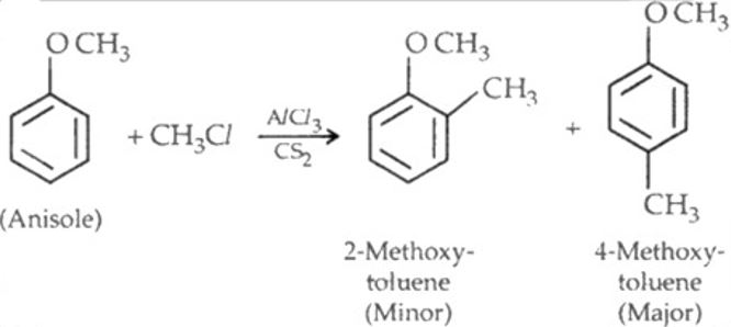 Anisole undergoes Friedel-Crafts reaction, i.e., the alkyl and acyl groups are introduced at ortho and para positions by reaction with alkyl halide and acyl halide in the presence of anhydrous aluminium chloride (a Lewis acid) as catalyst. |