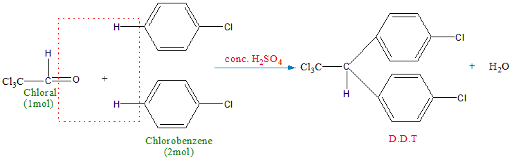 The correct answer is option 4. Trichloroacetaldehyde. DDT is produced by the reaction of chlorobenzene with trichloroacetaldehyde in the presence of a catalyst, such as anhydrous \(AlCl_3\). The reaction proceeds through a Friedel-Crafts acylation reaction. The reaction is illustrated below: