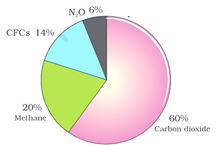 The correct answer is Option (4)- CO The greenhouse effect is a naturally occurring phenomenon that is responsible for heating of Earth’s surface and atmosphere. Earth’s surface re-emits heat in the form of infrared radiation but part of this does not escape into space as atmospheric gases (e.g., carbon dioxide, methane, etc.) absorb a major fraction of it. The molecules of these gases radiate heat energy, and a major part of which again comes to Earth’s surface, thus heating it up once again. This cycle is repeated many a times. The above-mentioned gases – carbon dioxide and methane – are commonly known as greenhouse gases because they are responsible for the greenhouse effect. Relative contribution of various greenhouse gases to total global warming |