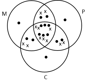 ∴ Number of students studying exactly one subject using dots and cross method n(exactly one subject) $=n (M) + n (P) + n (C) -2 \{n (M∩P) + n (P∩C) $=23+24+19-2(12+9+7) + 3× 4$ $=66-2 × 28 +12=22$ |
