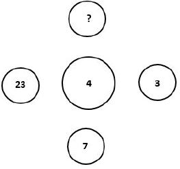 Consider the four surrounding numbers: 23, 3, 7, ?