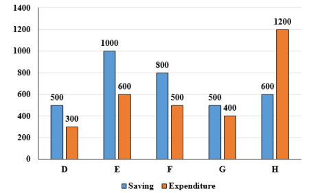 The bar graph given below shows the saving and expenditure of 5 companies D, E, F, G and H. The total income of all the companies is what percent of the total expenditures? |