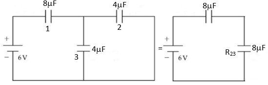 The correct answer is Option (2) → 24 µC $R_{23}=R_2+R_3$ [In series] $R_{23}=4+4=8µF$ Now, $\frac{1}{C_{eq}}=\frac{1}{8}+\frac{1}{8}$ [In parallel] $⇒C_{eq}=4µF$ Charge (Q) = CV $=4×6=24µC$ and, Charge will be same in both the capacitor. $∴C_1=24µC$ |