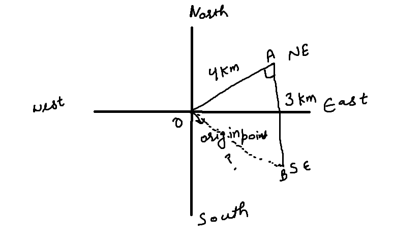 Total distance = 4 km + 3 km = 7 km Shortest distance = in triangle OAB (AS PER GIVEN IMAGE) OAB OB2 = OA2 + AB2 = 42 + 32 = 16 + 9 = 25 OB = 5 KM