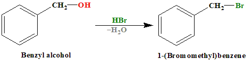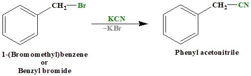 Benzyl alcohol \((C_6H_5CH_2OH)\) is treated with hydrobromic acid \((HBr)\) to convert the hydroxyl group \((-OH)\) into a bromide group, forming benzyl bromide \((C_6H_5CH_2Br)\). This is a typical substitution reaction where the -OH group is replaced by a -Br atom. Step 2: Conversion of Benzyl Bromide to Phenylacetonitrile