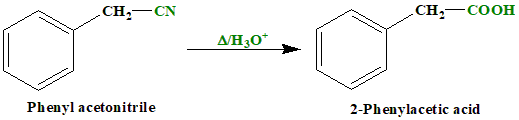 Benzyl bromide is then reacted with potassium cyanide \((KCN)\), which introduces a cyanide group \((-CN)\) in place of the bromide, forming phenylacetonitrile \((C_6H_5CH_2CN)\). This is a nucleophilic substitution reaction where the cyanide ion replaces the bromide ion. Step 3: Hydrolysis of Phenylacetonitrile to Phenylethanoic Acid