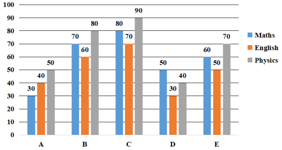 Study the following graph and answer the question that follows. Marks scored by five students A, B, C, D and E in three subjects (Maths, English and Physics). Total marks for each subject are 100. What is the percentage marks obtained by E in all three subjects together? (Assuming maximum marks for each subject are 100.) |